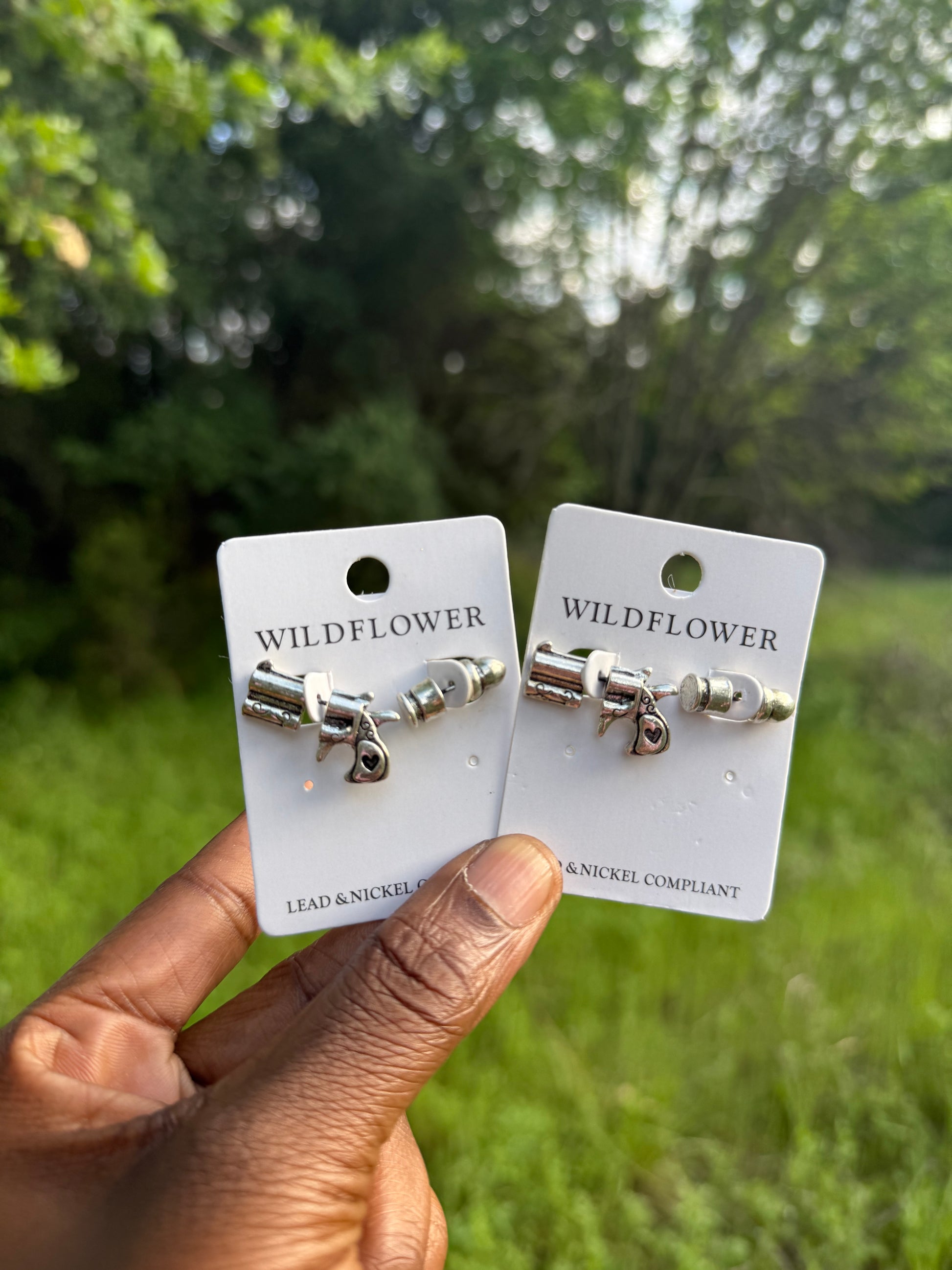 Glossy silver earrings are designed to resemble fake plug earrings in the shape of a weapon and a bullet. $10.99.